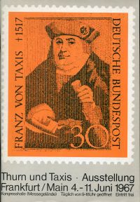 Taxis, Franz von: Gedächtnisausstellung zum 450. Todestag Franz von Taxis. Frankfurt a.M., 4. – 11. Juni 1967. [Ausstellungskatalog]. Frankfurt/Main: Bundespostmuseum 1967. 8°. 22 Bl., 1 Farbabbildung, einige sw-Abbildungen, geheftet (gut erhalten)