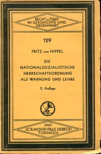 Hippel, Fritz von: Die nationalsozialistische Herrschaftsordnung als Warnung und Lehre. Eine juristische Betrachtung. 2. Auflage. Tübingen: Mohr 1947. 8°. 55 S., broschiert (Seiten unbeschnitten; angebräunt; leichte Randläsuren) (=Recht und Staat in Geschichte und Gegenwart ; 129)