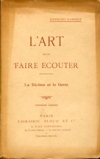Dammien, Harmand: L’Art de se faire ecouter. La Diction et le geste à l’usage de MM. les avocats, Conférenciers et Prédicateurs. Paris: Bloud o. J. 8°. 189 S., zahlreiche sw-Abbildungen, broschiert (gebräunt; angestaubt; teilweise stockfleckig; Vorsatz mit kleiner Fehlstelle ohne Textverlust)