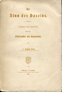 Stein, Ludwig: Der Sinn des Daseins. Streifzüge eines Optimisten durch die Philosophie der Gegenwart. Tübingen und Leipzig: Mohr 1904. Gr.-8°. XI, 437 S., broschiert (Umschlag angestaubt und wenig abgegriffen; Seiten teilweise nicht aufgeschnitten; sonst altersgemäss gut erhalten) Text in Fraktur.