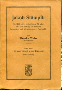 Weiss, Theodor: Jakob Stämpfli. Ein Bild seiner öffentlichen Tätigkeit und ein Beitrag zur neueren bernischen und schweizerischen Geschichte, Band 1. 1 Band 2 Teilen. Bern: Ferd. Wyss, 1921. 8°. VII, 572 S., 1 Porträt, broschiert (Seiten nicht beschnitten; Einband mit leichten Gebrauchsspuren; altersgemäss gut erhalten) mehr nicht erschienen.