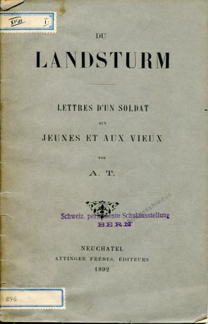 T., A.: Du Landsturm. Lettres d’un soldat aux jeunes et aux vieux. Neuchâtel: Attinger Frères 1892. 8°. 31 S., broschiert (Bibliotheksexemplar; Stempel auf Einband)
