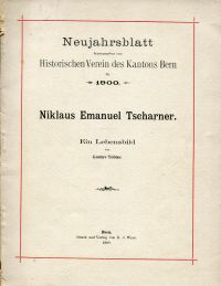 Tobler, Gustav: Niklaus Emanuel Tscharner – Ein Lebensbild. Bern: Wyss 1899. Lex.-8°. 46 S., Porträt, broschiert (Rücken teilweise mit Fehlstellen ohne Textverlust; Papier altersbedingt leicht gebräunt; altersgemäss gut erhalten) (=Neujahrsblatt / hrsg. vom Historischen Verein des Kantons Bern, 1900) Text in Fraktur.