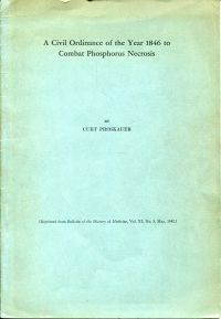 Proskauer, Curt: A civil ordinance of the year 1846 to combat phosphorus necrosis. 1942. 8°. S. 561-575., Faksimiles, broschiert (Gerbauchsspuren; Papier leicht gebräunt; Bleistiftmarginalien auf Umschlag hinten) (=Sonderdruck aus: Bulletin of the History of Medicine; Vol. 11, No. 5, May 1942)