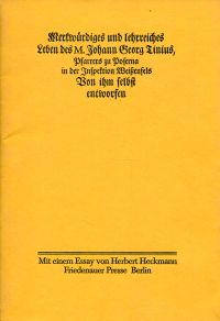 Tinius, Johann Georg: Merkwürdiges und lehrreiches Leben des M. Johann Georg Tinius, Pfarrers zu Poserna in der Inspektion Weissenfels von ihm selbst entworfen. Mit einem Essay von Herbert Heckmann. Berlin: Friedenauer Presse 1989 ?. 4°. 23 S., geheftet (Seiten nicht beschnitten; Umschlag leicht angestaubt; sonst gut erhalten) Ein Beitrag zur Geschichte der Bibliomanie. Text in Fraktur.