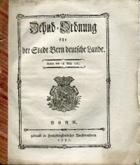Zehnd-Ordnung für der Stadt Bern deutsche Lande. Geben den 18. Mäy 1787. Bern: Hochobrigkeitliche Buchdruckerey 1787. 8°. 14 S., [1] Bl. (unbedruckt), broschiert (leicht angestaubt; Randläsuren; sonst altersgemäss gut erhalten)