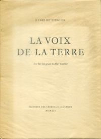 Ziegler, Henri de: La voix de la terre. Avex 8 bois gravés de Marc Gonthier. Lausanne: Ed. des Terreaux 1952. 8°. 50 S., 8 Illustrationen, broschiert (gut erhalten) Vorliegend Ex. Nr. 484.