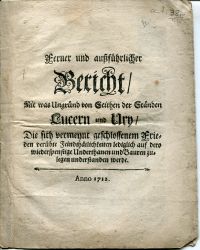 Ferner und aussführlicher Bericht mit was Ungründ von Seithen der Ständen Lucern und Ury die sint vermeynt geschlossenem Frieden verübte Feindthätlichkeiten lediglich auf dero widerspenstige Underthanen und Bauren zulegen understanden werde. Bern: s.n. 1712. 8°. 8 S., broschiert (teilweise abgedunkelt; leicht stockfleckig und leicht angestaubt; Randläsuren)