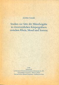 Gorecki, Joachim: Studien zur Sitte der Münzbeigabe in römerzeitlichen Körpergräbern zwischen Rhein, Mosel und Somme. Mainz: von Zabern 1975. Lex.-8°. 288 S., Illustrationen, broschiert (private Widmung des Autors auf Titelblatt; gut erhalten) (=Aus: Bericht der Römisch-Germanischen Kommission. 56. 1975, S. 180 – 467)