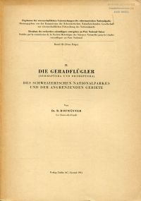 Hofmänner, B.: Die Geradflügler (Dermaptera und Orthoptera) des Schweizerischen Nationalparkes und der angrenzenden Gebiete. Liestal: Lüdin 1951. Gr.-8°. S. 241 – 310, broschiert (Stempel auf Umschlag und Titelblatt; gut erhalten) (=Ergebnisse der wissenschaftlichen Untersuchungen des schweizerischen Nationalparks, N.F., 3,25)