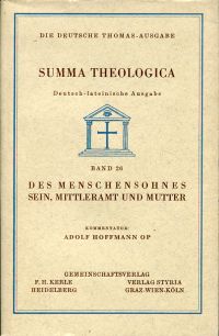 Thomas von Aquin: Des Menschensohnes Sein, Mittleramt und Mutter. 3, 16-34. Kommentiert von Adolf Hoffmann OP. 1.-4. Tsd. Heidelberg: Kerle; Graz: Styria 1957. 8°. 17, 646 S., Leinen (Schutzumschlag angestaubt und mit kleiner Fehlstelle; ohne Vorsatzblatt; sonst gut erhalten) (=Die deutsche Thomas-Ausgabe, : vollständige, ungekürzte deutsch-lateinische Ausgabe der Summa theologica. Übersetzt von Dominikanern u. Benediktinern Deutschlands u. Österreichs. Hrsg. vom Kath. Akademikerverband ; Bd. 26)