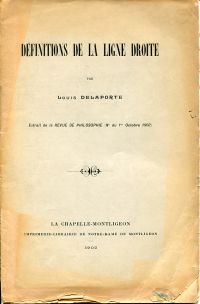 Delaporte, Louis-Joseph: Définitions de la ligne droite. La Chapelle-Montligeon: Imprimerie-librairie de Notre-Dame de Montligeon 1902. Gr.-8°. 19 S., Broschiert (private Widmung des Autors auf Titelblatt; Papier altersbedingt leicht gebräunt; Gebrauchsspuren) (=Extrait de la Revue de Philosophie; No. 1, 1902)
