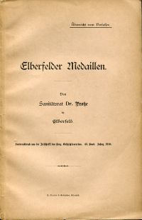 Protze, Hermann: Elberfelder Medaillen. Elberfeld: Martini & Grüttefien 1910. 8°. S. 91 – 113, 29 sw-Abbildungen, Broschiert (Umschlag mit kleiner Fehlstelle; sonst altersgemäss gut erhalten)