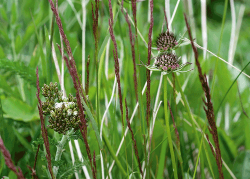 bildreich karten PK 1129: wiesengefluester I. Querformat. (Gräser, Skabiosen, Garten, Traumgarten, Wind)