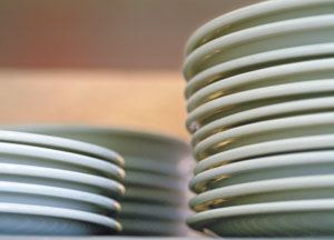 bildreich karten PK 116: teller I. Querformat. 2003. (Teller, Tellerberg, Tellerstapel, Porzellan, Einladung, Küche, Gastro) Mindestbestellmenge: 15 Karten (auch assortiert).