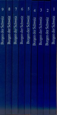 Meyer, Werner (Red.): Burgen der Schweiz. 9 Bände cplt. Zürich: Silva 1981. Lex.-8°. Insgesamt 859 S., zahlreiche Farbabbildungen auf Tafeln, Planskizzen im Text, gebunden (Einband mit leichten Gebrauchsspuren; gut erhalten) Band 1: Uri, Schwyz, Unterwalden, Glarus, Zug – Band 2: Tessin, Graubünden (italienischsprachiger Teil) – Band 3: Graubünden (deutschsprachiger Teil und romanischer Teil) – Band 4: Genf, Waadt, Wallis – Band 5: Zürich, Schaffhausen – Band 6: St. Gallen, Thurgau, Appenzell-Innerrhoden, Appenzell-Ausserrhoden – Band 7: Basel-Stadt, Basel-Land, Solothurn, Neuenburg, Jura, Laufenthal – Band 8: Luzern, Aargau – Band 9: Bern, Freiburg.