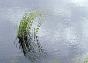 bildreich karten PK 188: schilfbüschel. Querformat. 2005. (Schilf, Gras, Insel, Weiher, See, Alp, Spiegelung)