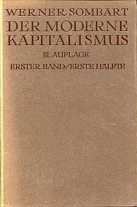 Sombart, Werner: Der moderne Kapitalismus. historisch-systematische Darstellung des gesamteuropäischen Wirtschaftslebens von seinen Anfängen bis zur Gegenwart. 3., unveränd. Aufl. 2 Bände in 4 Teilen (von 3). Berlin: Duncker & Humblot 1919. Gr.-8°. XXII, 919; 1229 S. Halbleinen mit Kopffarbschnitt Einband mit leichten Gebrauchsspuren; Buchblöcke leicht geknickt, dadurch teilweise locker; Rücken abgeblasst; sonst altersgemäss gut erhalten) Band 1: Die vorkapitalistische Wirtschaft : Einleitung, die vorkapitalistische Wirtschaft, die historischen Grundlagen des modernen Kapitalismus; mit Registern über Band 1 und 2 – Band 2: Das europäische Wirtschaftsleben im Zeitlater des Fühkapitalismus vornehmlich im 16., 17. und 18 Jahrhundert.