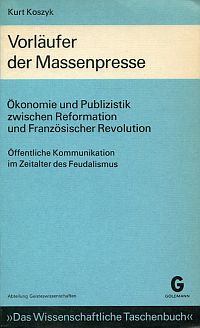 Koszyk, Kurt: Vorläufer der Massenpresse. Oekonomie und Publizistik zwischen Reformation und Französischer Revolution. Oeffentliche Kommunikation im Zeitalter des Feudalismus. München: Goldmann 1972. 8°. 151 S., Anmerkungen, Bibliographie, Personenverzeichnis, broschiert (gut erhalten) (=Das wissenschaftliche Taschenbuch, Abteilung Geisteswissenschaften, Bd. 5)