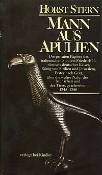 Stern, Horst: Mann aus Apulien. Die privaten Papiere des italiensichen Staufers Friedrich II., römisch-deutscher Kaiser, König von Sizilien und Jerusalem, Erster nach Gott, über die wahre Natur der Menschen und der Tiere, geschrieben 1245 – 1250. München: Kindler 1986. 8°. 479 S. Leinen (gut erhalten)