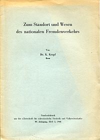 Krapf, Kurt: Zum Standort und Wesen des nationalen Fremdenverkehrs. Bern: Stämpfli 1944. 8°. S. 158-170. Geheftet (angebräunt, leicht bestossen) (=Sonderdruck aus: Zeitschrift für Schweizerische Statistik und Volkswirtschaft; 80. Jahrgang, Heft 2, 1944)