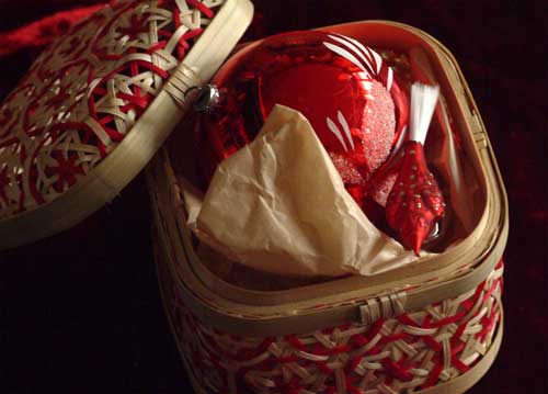 bildreich karten PK 766: weihnachtsgeschenk. Querformat. (Geschenk, Verpackung, Geflecht, geflochten, Korb, Körbchen, Kugel, Vogel) Mindestbestellmenge: 15 Karten (auch assortiert).