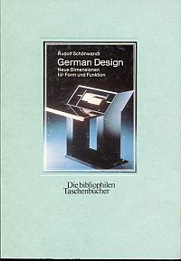 Schönwandt, Rudolf: German Design. neue Dimensionen für Form und Funktion. 2. Aufl. Dortmund: Harenberg 1991. 8°. 183 S., durchgehend Farbabbildungen, broschiert (gut erhalten) (=Die bibliophilen Taschenbücher, Nr. 591)