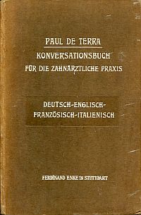 Terra, Paul de: Konversationsbuch für die zahnärztliche Praxis. Eine Sammlung von Kunstausdrücken und Redensarten in deutscher, englischer, französischer und italienischer Sprache = Manual of conversation for the dental profession = Manuel de conversation pour la profession dentaire = Manuale di conversazione per la professione dentistica. Stuttgart: Enke 1908. 8°. 274 S., Pappband (private Widmung auf Vortitel; teilweise stockfleckig; Einband mit leichten Gebrauchsspuren; Papier altersbedingt leicht gebräunt)