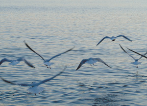 bildreich karten PK 230: dämmerstunde. Querformat. 2006. (Möwen, Vögel, Fliegen, Flug, Flügel, Schwingen, Gruppe, Abend, Dämmerung, See, Meer, Abflug, Start) Mindestbestellmenge: 15 Karten (auch assortiert).