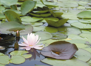 bildreich karten PK 269: divina flor. Querformat. 2007. (Seerosen, Blätter, Frosch, Schilf, Schatten, Spiegelung, Seerose)