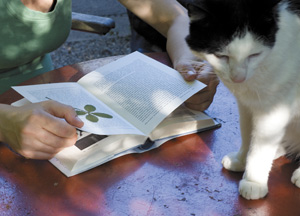 bildreich karten PK 303: heiligberger nachmittag mit wilma. Querformat. (Katze, Klee, Glück, Glücksklee, Tisch, Garten, Schatten)