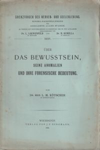 Kötscher, Louis Max: Über das Bewusstsein, seine Anomalien und ihre forensische Bedeutung. Wiesbaden: Bergmann, 1905. 109 S. Broschiert Einband mit leichten Gebrauchsspuren, angestaubt und befleckt; Rücken mit kleinen Fehlstellen; Seiten teilweise unbeschnitten) (=Grenzfragen des Nerven- und Seelenlebens, 35)