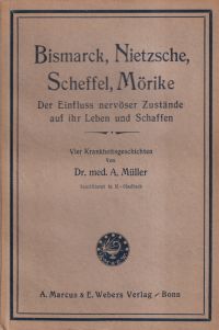 Müller, August: Bismarck, Nietzsche, Scheffel, Mörike. Der Einfluss nervöser Zustände auf ihr Leben und Schaffen. Vier Krankheitsgeschichten. Bonn: Marcus & Webers 1921. Gr.-8°. V, 102 S., broschiert (Seiten nicht beschnitten; sonst gut erhalten)