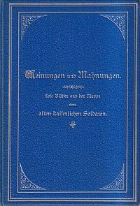 Wetzer, Leander von: Meinungen und Mahnungen. lose Blätter aus der Mappe eines alten kaiserlichen Soldaten. Wien, Seidel, 1893. 8°. 116 S., 2 lose Faksimile, Leinen mit umlaufendem Farbschnitt (Ex Libris auf Innendeckel; altersgemäss gut erhalten) Text in Fraktur.