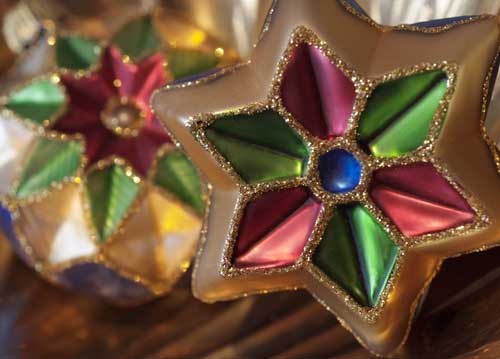 bildreich karten PK 977: sternenpaar. Querformat. (Weihnachtsschmuck, Weihnachtskugel, Paar, Stern, gold, Harlekin)