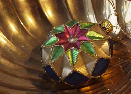 bildreich karten PK 979: goldglanz. Querformat. (Weihnachtsschmuck, Weihnachtskugel, Harlekin, gold) Mindestbestellmenge: 15 Karten (auch assortiert).