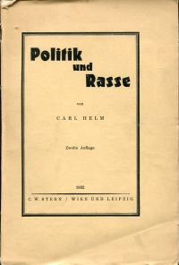 Helm, Carl: Politik und Rasse. 2. Auflage. Wien und Leipzig: C. W. Stern 1932. Gr.-8°. 200 S., broschiert (private Widmung des Autors auf Titelblatt; Umschlag mit leichten Randläsuren, wenig abgegriffen und kleinen Einrissen im Gelenk; wenig Bleistiftanstreichungen)