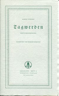 Steffen, Albert: Tagwerden. (Erste Erinnerungen). St. Gallen: Tschudy 1951. 8°. 15 S., lose in Umschlag (Umschlag mit leichten Randläsuren; gut erhalten) (=Der Bogen ; H. 11)