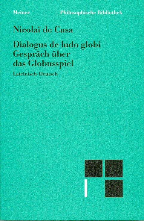 Nicolaus de Cusa: Gespräch über das Globusspiel. Lateinisch-Deutsch. Hamburg: Meiner 2000. 8°. XV, 178 S., Anmerkungen, Register,. broschiert (sehr gut erhalten) (=Schriften des Nikolaus von Kues in deutscher Übersetzung; H. 22; zugl. Philosophische Bibliothek; Bd. 467) Im Ausgang von einem simplen Kugelspiel wird anhand von Gestalt und Bewegung der Kugel die „mystische Bedeutung“ des Spiels zu einer theologischen, kosmologischen, anthropologischen Deutung einer Drei-Welten-Theorie (Gott, Universum, Mensch) mit einer zuvor noch nicht formulierten Intentionen- und Wertenlehre.