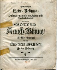 Bourgeois, David: Der Papisten Lehr-Uebung, dasz man, namlich, den Ketzern nicht Glauben halten solle. Und dargegen Gottes Raach-Uebung, Frisches Exempel An den Lucernern und Urnern In der Schweitz. Wahrstatt 1712. 8°. 16 S., broschiert (befleckt und angestaubt; Umschlag mit zwei Klebestreifen repariert und mit handschriftlichen Vermerken von alter Hand)