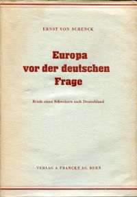 Schenck, Ernst von: Europa vor der deutschen Frage. Briefe eines Schweizers nach Deutschland. Bern: Francke 1946. Gr.-8°. 224 S., Engl. broschiert (Umschlag mit leicht Randläsuren; Papierbedingt leicht gebräunt; sonst gut erhalten)