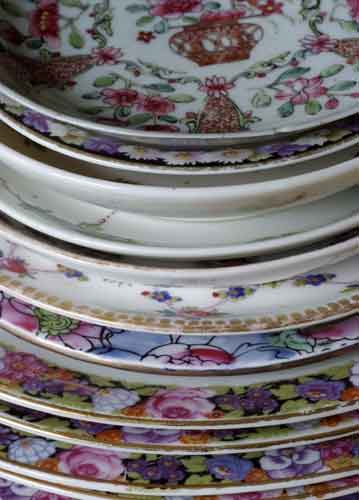 bildreich karten PK 657: bluemchenteller. Hochformat. (Porzellan, Teller, Blumen, Blümchen, Tellerberg, Stapel, Geschirr, Einladung, Kuchenteller, Dessert, Nachspeise)
