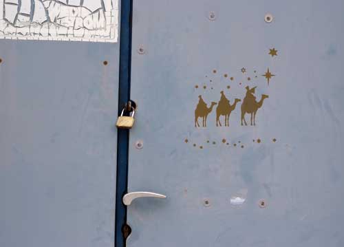bildreich karten PK 860: unterwegs. Querformat. (Türe, Tor, Schloss, Türfalle, silber, gold, Drei Könige, Morgenland, Kamele, Sterne, Weg)
