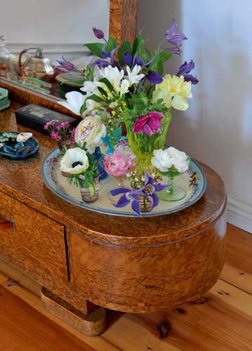 bildreich karten PK 904: stelldichein. Hochformat. (Tablett, Emaille, Vasen, Gläser, Anemone, Nelken, Clematis, Boudoir, Kommode, Spiegel)
